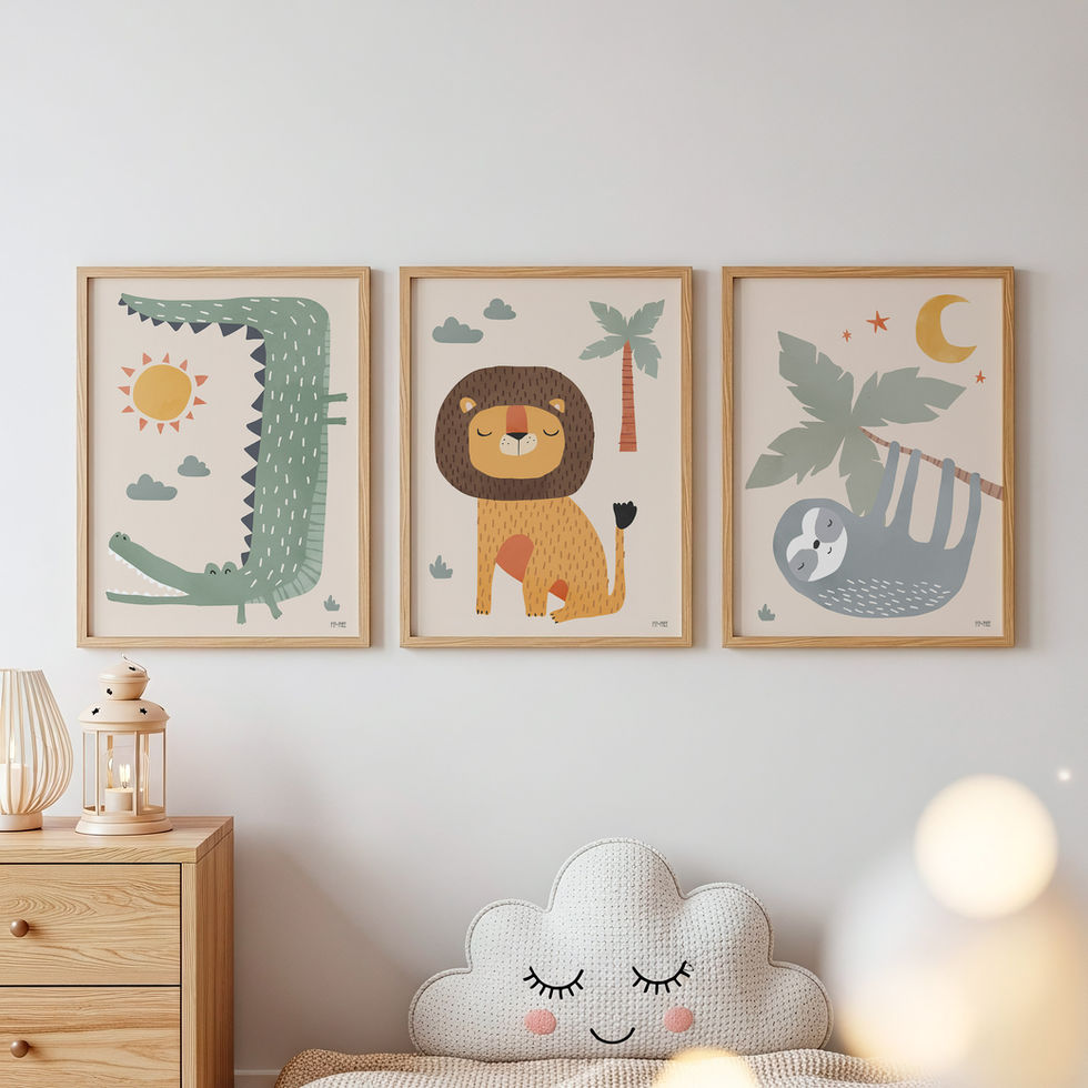 Uma seleção de personagens adoráveis inspirados na fauna tropical, criados para transformar quartos infantis em refúgios de calma, cor e imaginação. Leão, elefante, tucano, girafa e outros companheiros ganham vida em composições suaves e lúdicas, sempre em tons serenos e traços delicados.